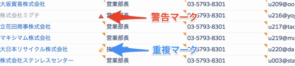 同じ名前のレコードが複数ある場合は重複マークが表示されます。マークが表示されているセルをダブルクリックして虫眼鏡アイコンをクリックすると、リンクしたいレコードが選択できます。